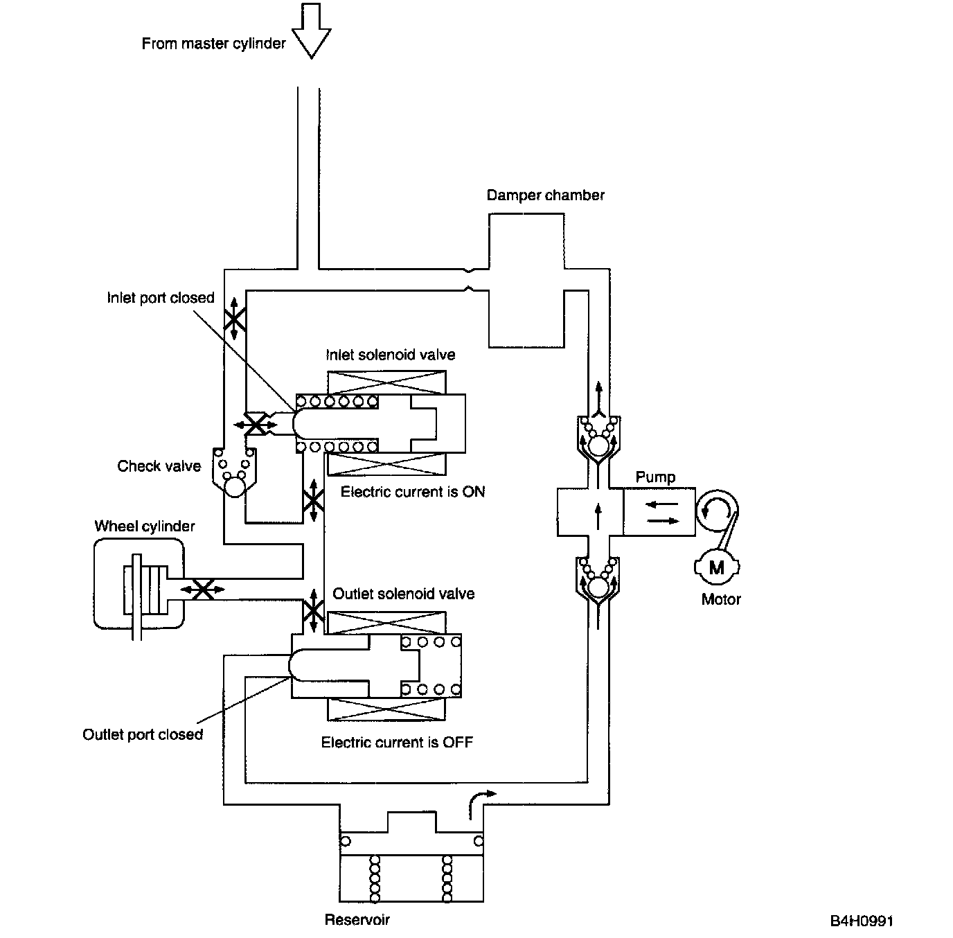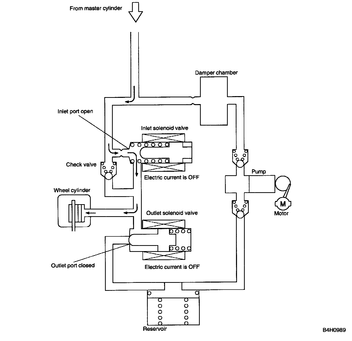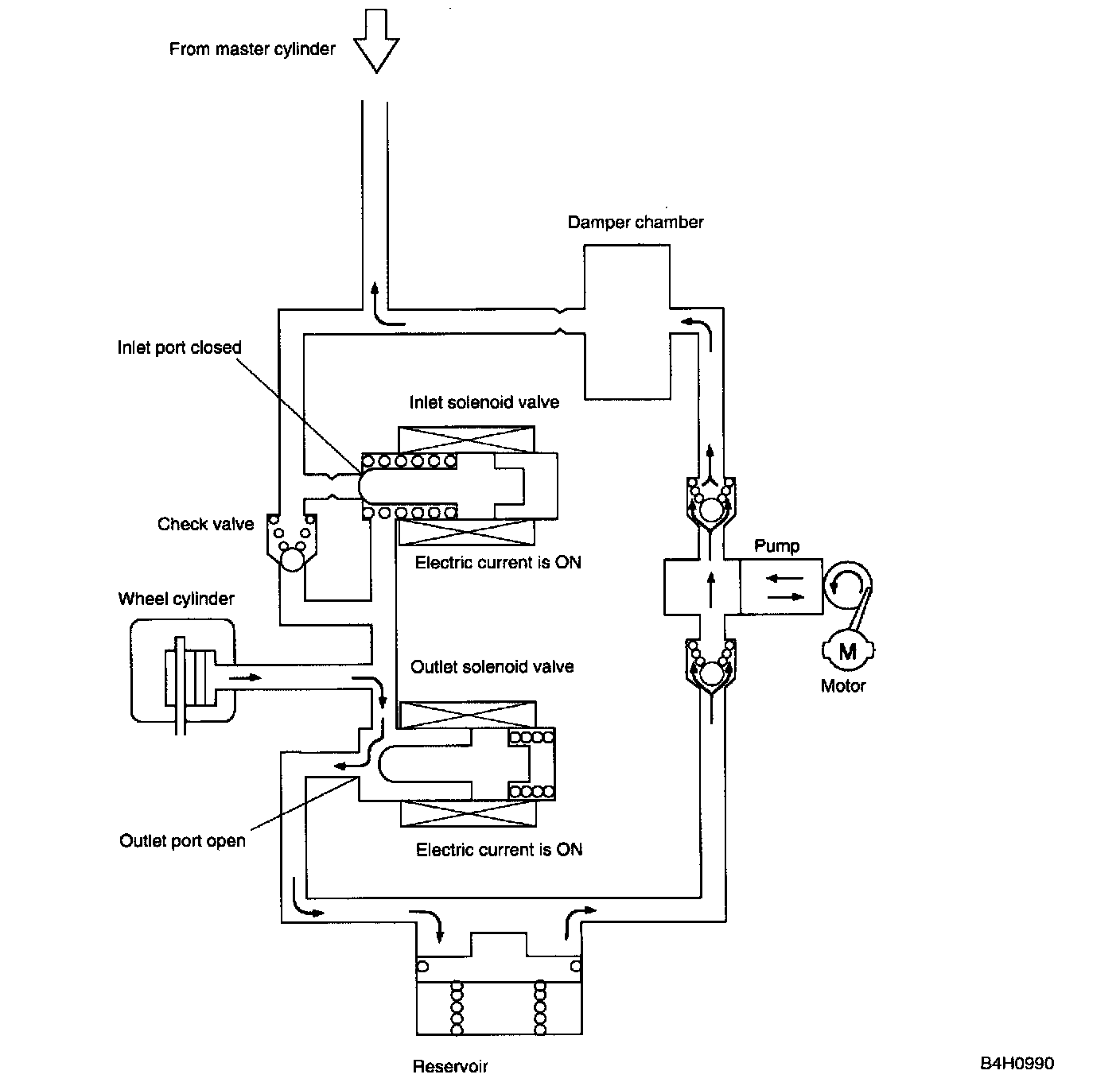 ^ The solenoid valve is a 2-position type solenoid valve which switches the brake fluid passages between the wheel and master cylinder and reservoir sides in response to an instruction from the ABSCM. For each wheel cylinder, a pair of normally-closed and -opened solenoid valves are provided.