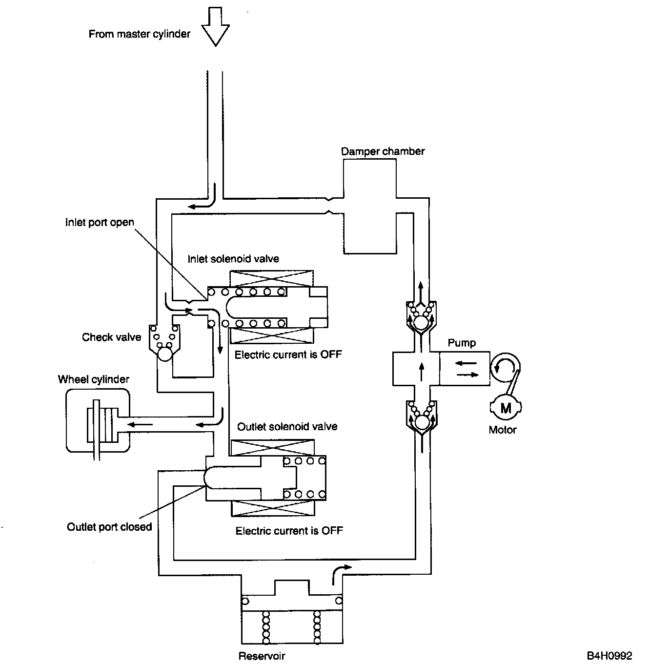 Since no current is supplied to the inlet and outlet solenoid valves, no solenoid valve attracting force is generated. So the valves remain stationary. Accordingly, the inlet port of the inlet solenoid valve is in an opened state, whereas the outlet port of the outlet solenoid valve is in a closed state. So the fluid pressure of the master cylinder is transmitted to the wheel cylinder to increase the brake force in the wheel cylinder. During Anti-lock Brake System (ABS) operation, the pump motor continues to operate.