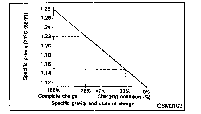 2. Measuring the specific gravity of the electrolyte in the battery will disclose the state of charge of the battery. The relation between the specific gravity and the state of charge is as shown in figure.