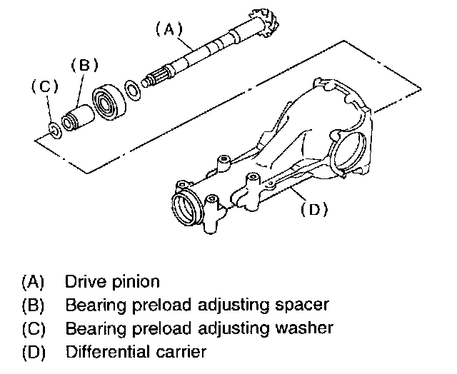 5) Insert drive pinion into differential carrier, install the previously selected bearing preload adjusting spacer and washer.