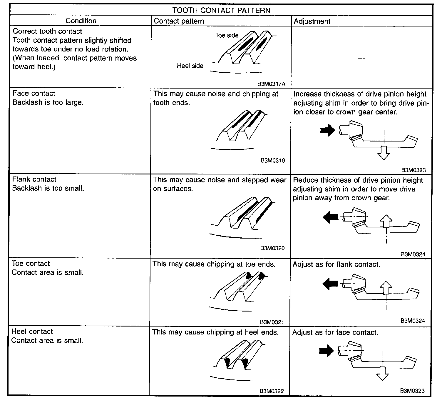 2. When the contact pattern is incorrect, readjust according to the instructions given in "TOOTH CONTACT PATTERN".
