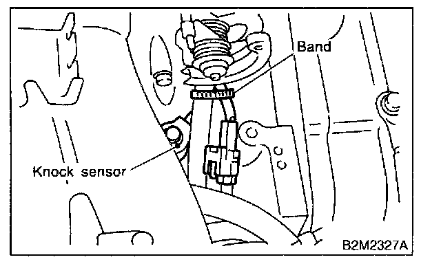 4. Remove band which holds knock sensor harness, and disconnect connector from knock sensor.