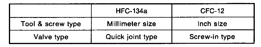CAUTION: When working on vehicles with the HFC-134a system, only use HFC-134a specified tools and parts. Do not mix with CFC-12 tools and parts. If HFC-134a and CFC-12 refrigerant or compressor oil is mixed, poor lubrication will result and the compressor itself may be destroyed. In order to help prevent mixing HFC-134a and CFC-12 parts and liquid, the tool and screw type and the type of service valves used are different. The gas leak detectors for the HFC-134a and CFC-12 systems must also not be interchanged.