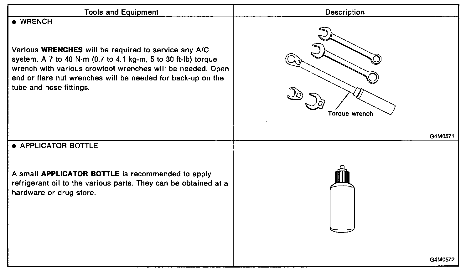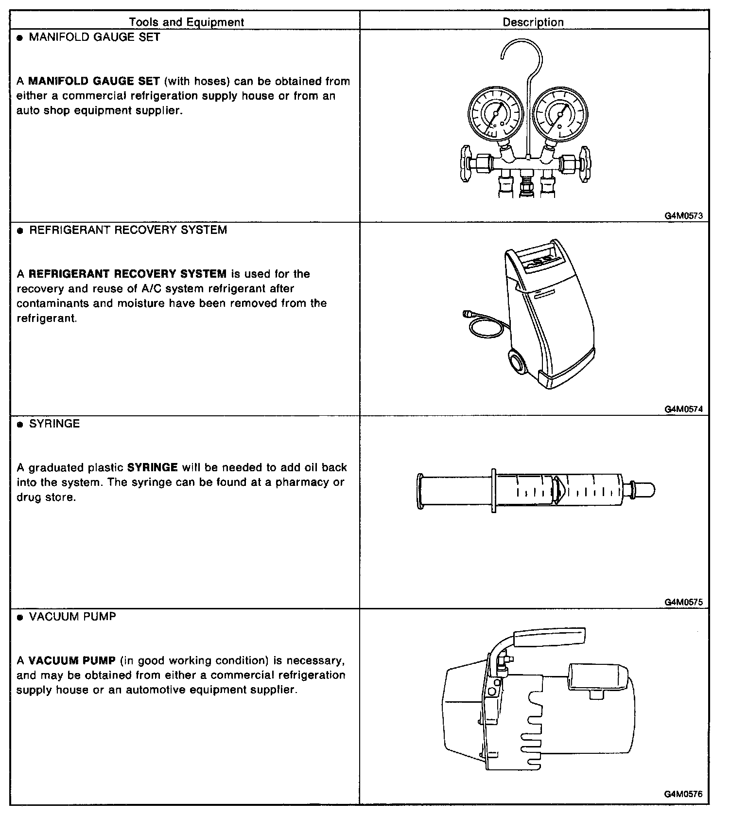 The following section provides information about the tools and equipment that will be necessary to properly service the A/C system.