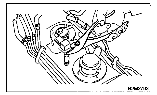 9. Move two fuel pipes to upper side, and remove bolt which install fuel tank pressure sensor to bracket.