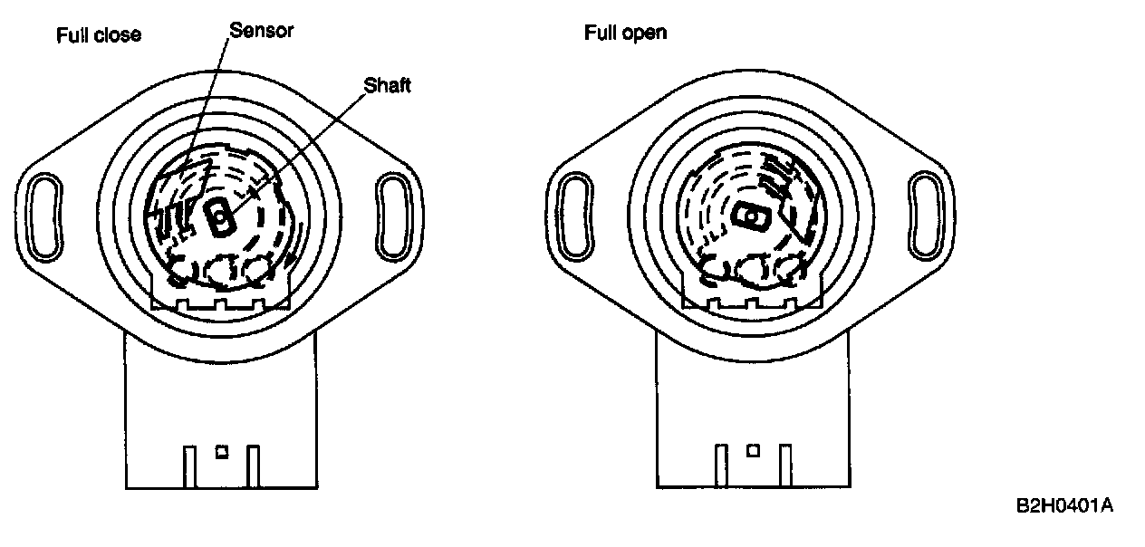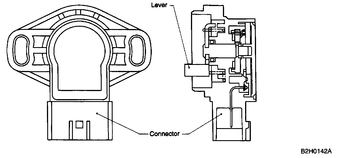 - This throttle position sensor sends the ECM a potentiometer output signal corresponding to the opening of the throttle valve. When the level of this signal exceeds a predetermined value, the ECM interprets it as complete closure of the throttle valve and makes a control most suitable for the engine operation with the throttle valve fully closed. For correcting error of this signal, the ECM is provided with a learning function.