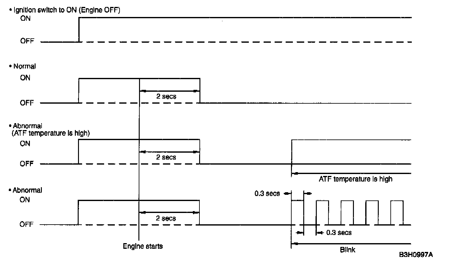 On starting the engine, AT OIL TEMP indicator lamp illuminates as shown below. If any trouble occurs, the lamp continues flashing until ignition switch is turned to ON position (engine turned off).
