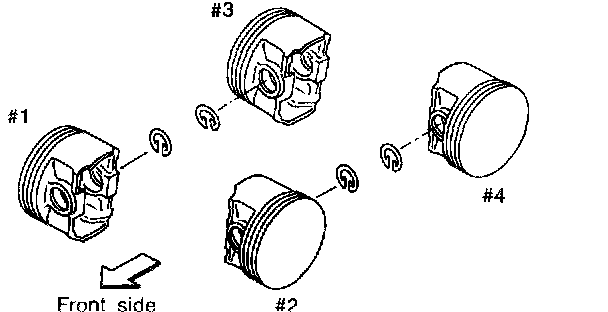 Turn cylinder block so that #3 and #4 cylinders face upward. Using the same procedures as used for #1 and #2 cylinders, install pistons and piston pins.