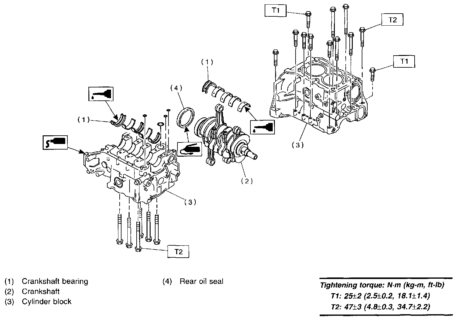 CAUTION: Remove oil in the mating surface of bearing and cylinder block before installation. Also apply a coat of engine oil to crankshaft pins.