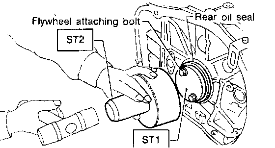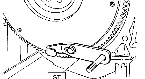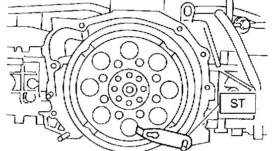 7. Install flywheel or drive plate. To lock crankshaft, use ST.