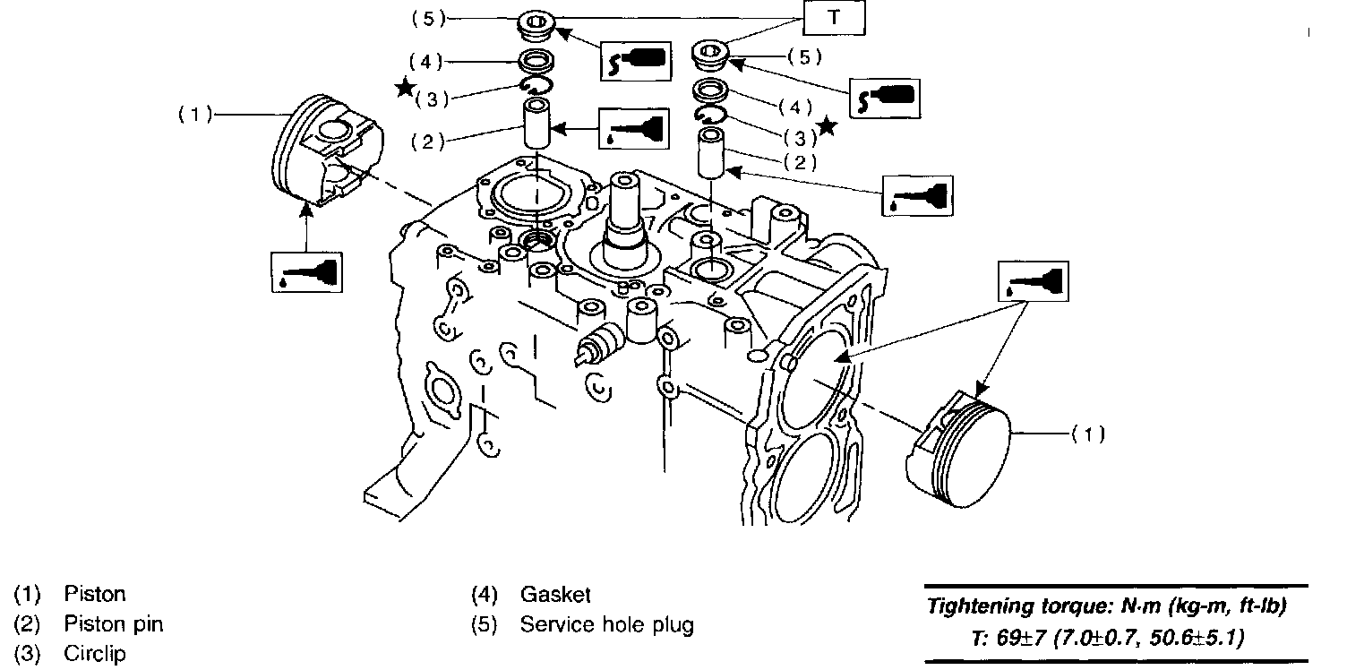 b. Apply a coat of engine oil to piston pin and insert piston pin into piston and connecting rod through service hole.