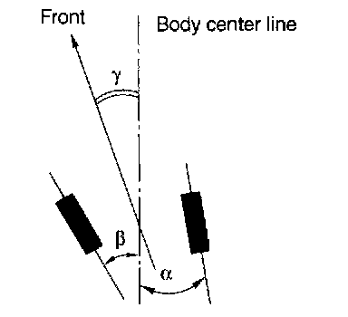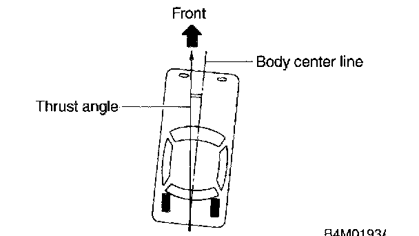 NOTE: Thrust angle refers to a mean value of left and right rear wheel toe angles in relation to vehicle body center line. Vehicle is driven straight in the thrust angle direction while swinging in the oblique direction depending on the degree of the mean thrust angle.
