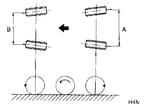 2. Mark rear sides of left and right tires at height corresponding to center of spindles and measure distance "B" between marks.