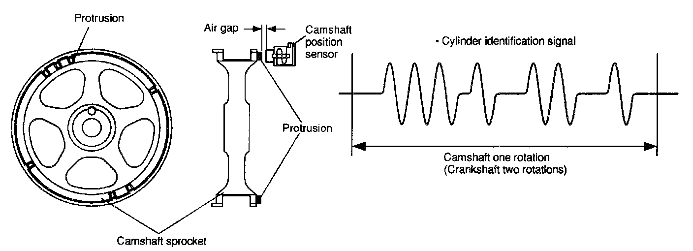 - It is designed so that the ECM accurately reads the number of pulses which occur when protrusions provided on the back of the left hand camshaft-drive sprocket cross the sensor Internal construction and the basic operating principle of the camshaft position sensor are similar to those of the crankshaft position sensor. A total of seven protrusions (one each at two locations, two at one location and three at one location) are arranged in four equal parts of the sprocket, as shown.