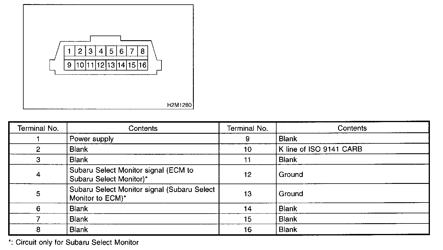 1. This connector is used both for OBD-II general scan tools and the Subaru Select Monitor.2. Terminal No.4 to No.6 of the data link connector is used for the Subaru Select Monitor signal.