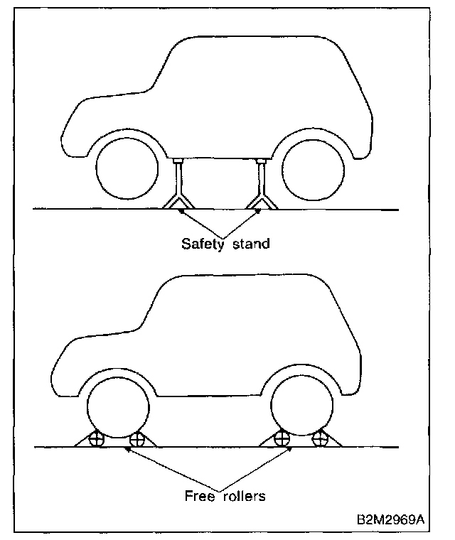 - In order to prevent the vehicle from slipping due to vibration, do not place any wooden blocks or similar items between the safety stands and the vehicle.