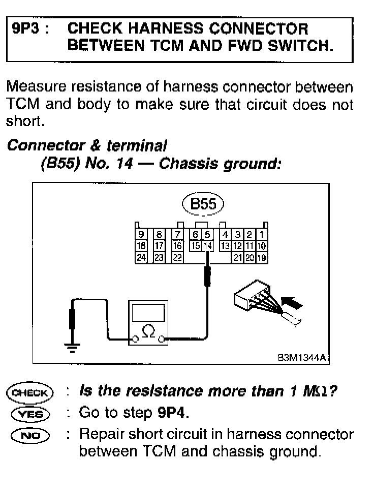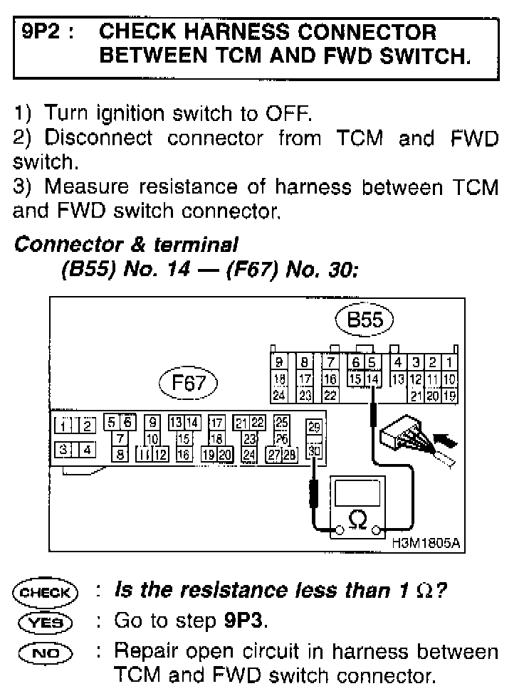 9P3 CHECK HARNESS CONNECTOR BETWEEN TCM AND FWD SWITCH.
