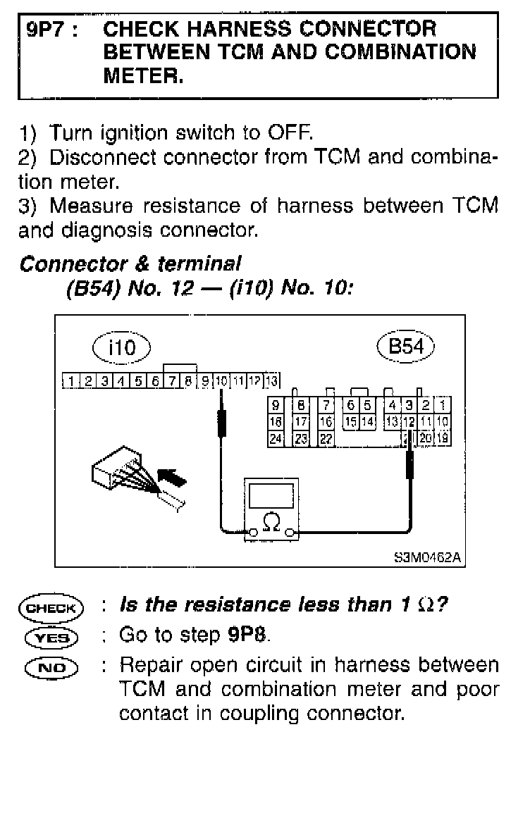9P7 CHECK HARNESS CONNECTOR BETWEEN TCM AND COMBINATION METER.