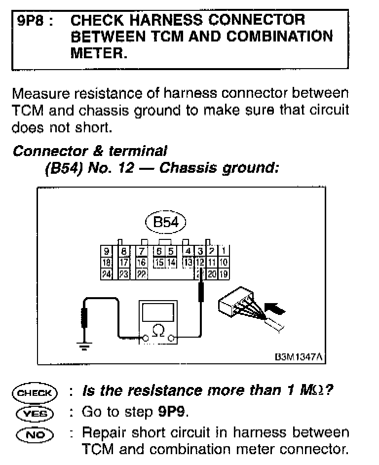 9P8 CHECK HARNESS CONNECTOR BETWEEN TCM AND COMBINATION METER.