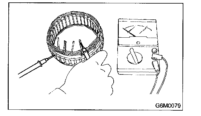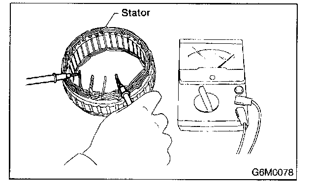 Inspect stator coil for continuity between stator core and each end of the lead wire. If there is continuity, the stator coil is short-circuited, and so replace stator assembly.
