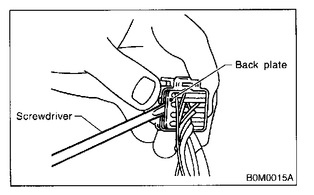 - When the connector has a back plate, remove the plate after removing the projection of the plate first. (Be careful not to use excessive force, since the terminals might brake off.)