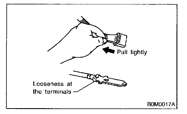 Poor contact is frequently caused by corroded terminals, dirt, foreign substances, weak contact points between male and female connectors, etc. Quite often a plug with poor contact will work perfectly again after it has been pulled off and reconnected. If harness and connector checks do not reveal any defect, it can be assumed that an intermittent contact in a connector is the source of trouble.