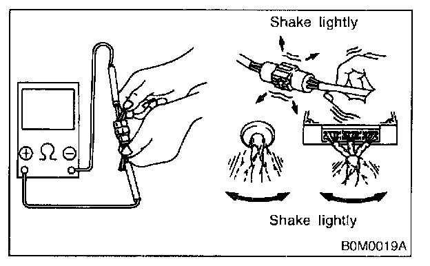 5. Shake lightly the connector and the harness, and check for sudden changes in voltage or resistance.