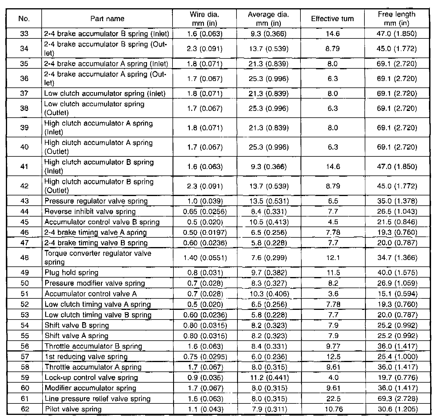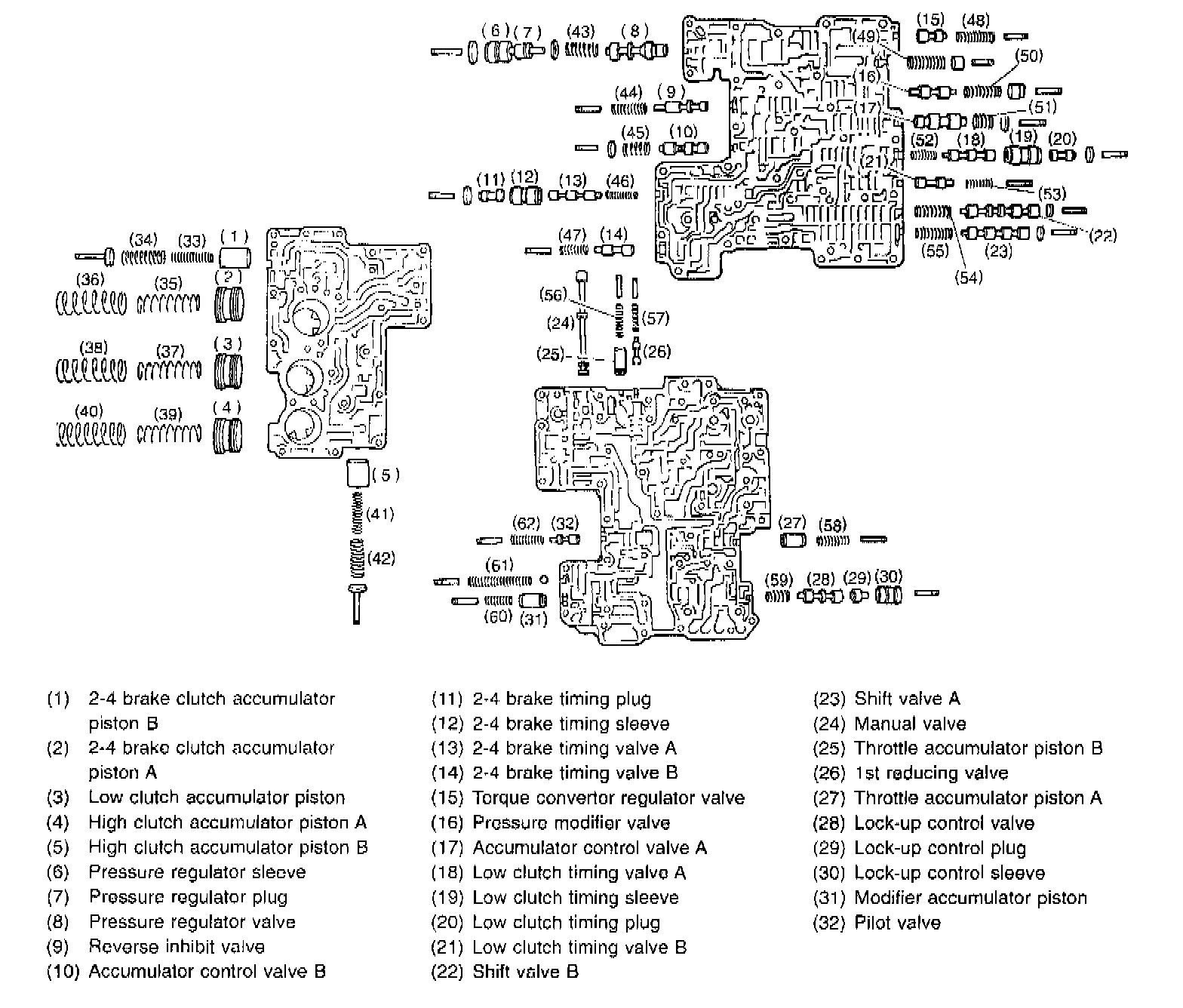 The control valve is composed of parts which are accurately machined to a high degree and should be handled carefully during disassembly and assembly. As these parts are similar in shape, they should be arranged in neat order on a table after disassembly so that they can be easily installed to their original positions. Spring loaded parts should be also handled carefully, as springs may jump out of place when the parts are disassembled removed. Extreme care should be taken so as to drop valves on the floor. Before assembling, the parts and valves should be dipped in a container filled with the ATF. Make sure that the valves are clean and free from any foreign material before assembly. Torque specifications should also be observed.