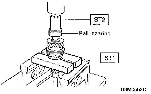 5) Drive ball bearing onto the rear section of transmission main shaft using ST1, ST2 and a press.