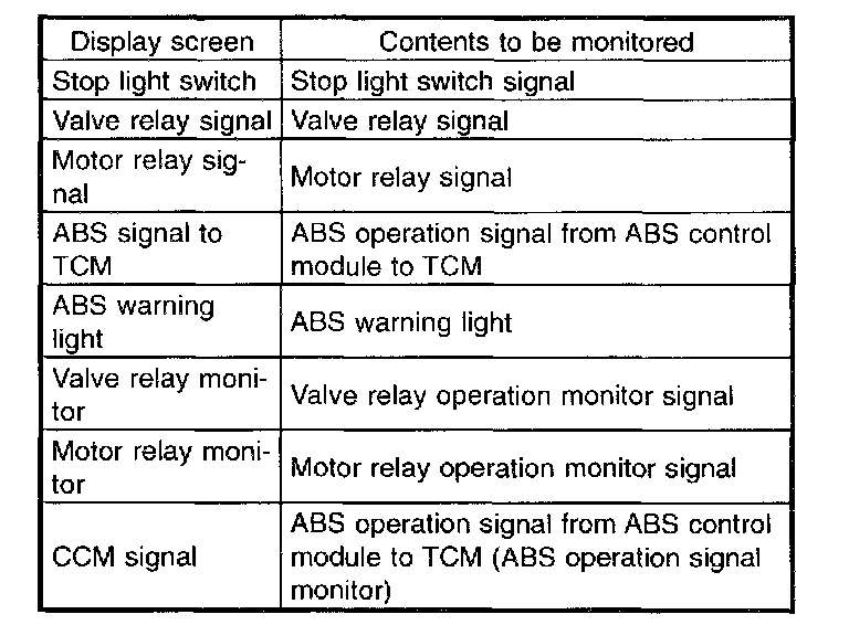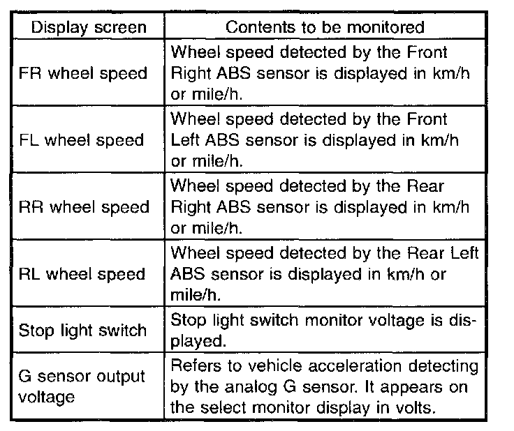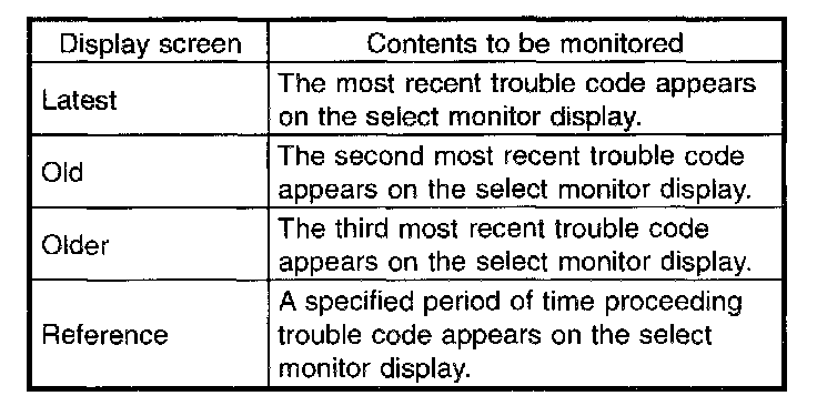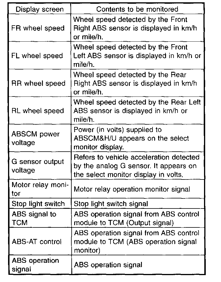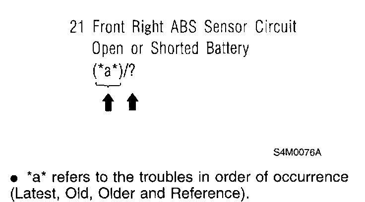 - If a particular trouble code is not properly stored in memory (due to a drop in ABSCM&H/U power supply, etc.) when a problem occurs, the trouble code, followed by a question mark "?", appears on the select monitor display. This shows it may be an unreliable reading.