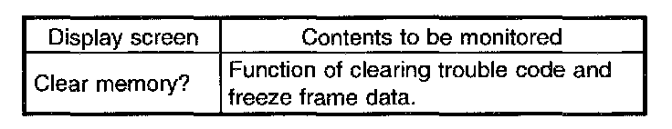 - If freeze frame data is not properly stored in memory (due to a drop in ABSCM power supply, etc.), a freeze frame data, preceded by a question mark "?", appears on the select monitor display. This shows it may be an unreliable reading. The value of the freeze frame data will be written over, and the memory cannot be cleared.