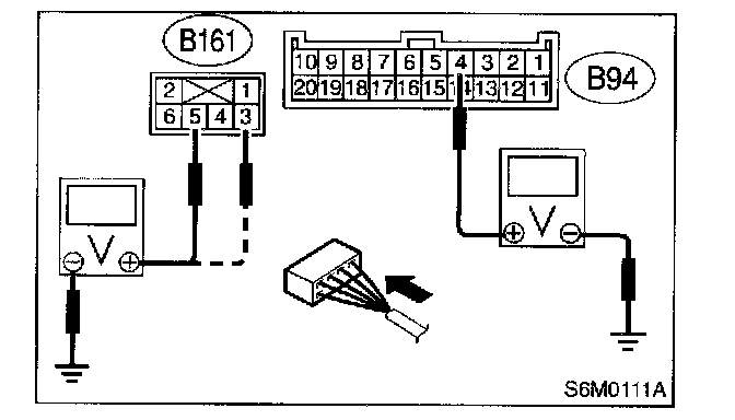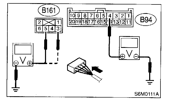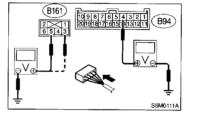 NOTE: Depress cruise control main switch with fingers while measuring voltage between (B161) No.5 and chassis ground.
