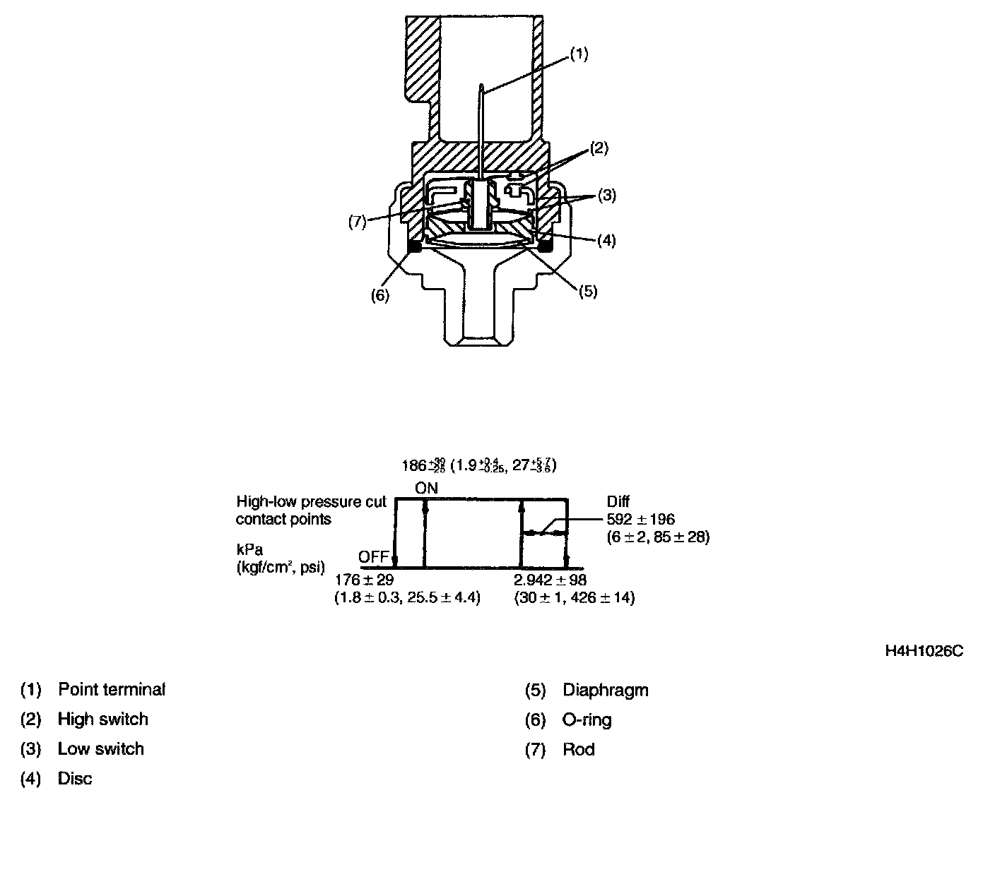 DUAL SWITCHThe dual switch is located in the high-pressure line of the refrigeration cycle. It consists of a diaphragm which receives pressure, diaphragm springs, pin and contact points. Two types of contact points are used. One type activates when the internal pressure is low or when it is too high while the other type controls the operation of the condenser fan.
