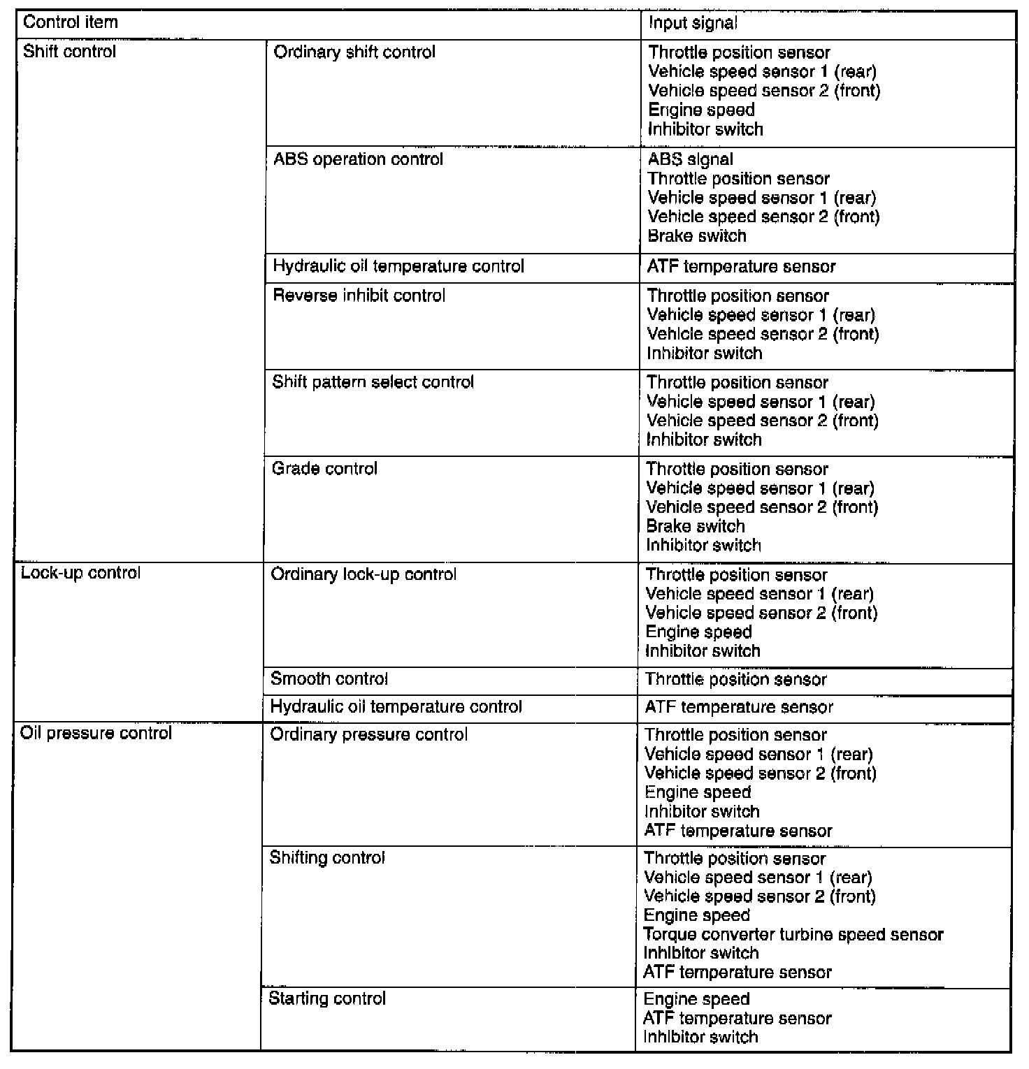 The lock-up engaging and disengaging conditions are set for 4th gear shift range, gear position and shift pattern and correspond to the throttle position and vehicle speed, and the duty solenoid electronically controlled by TCM controls the lock-up clutch. The lock-up clutch engagement and disengagement are controlled by the lock-up control valve.