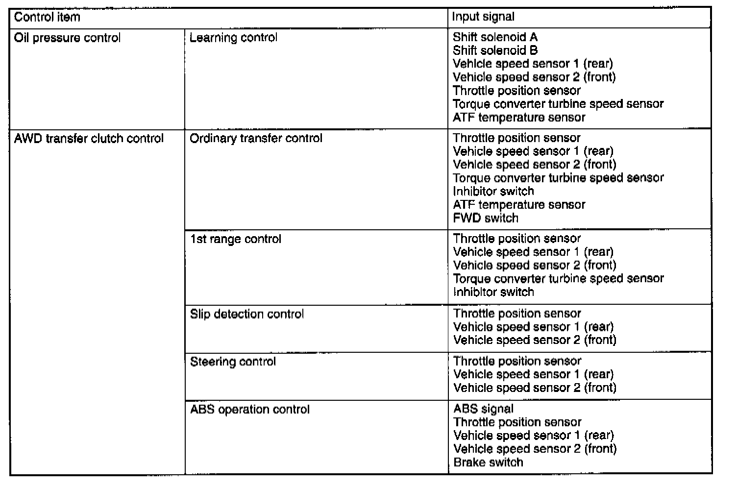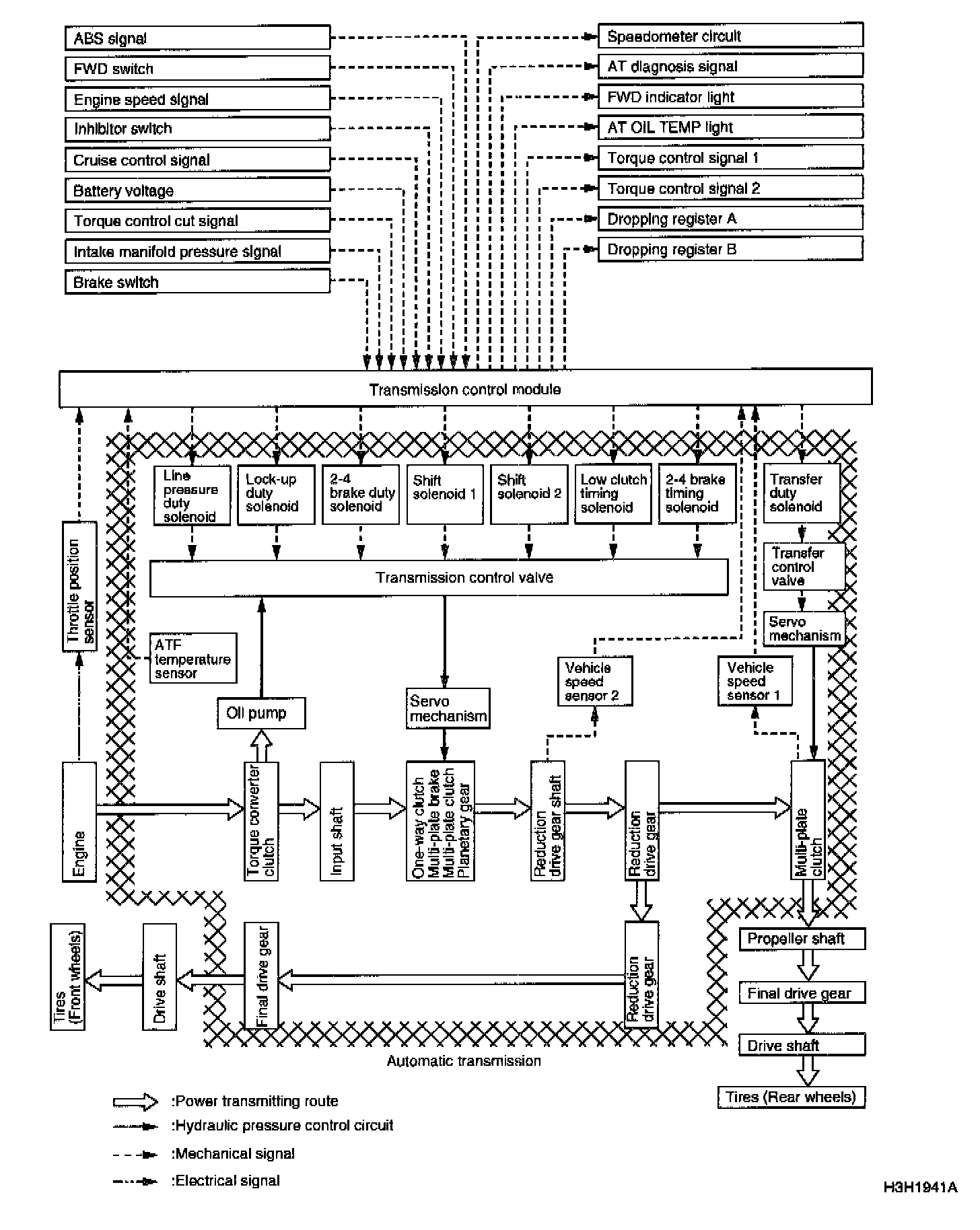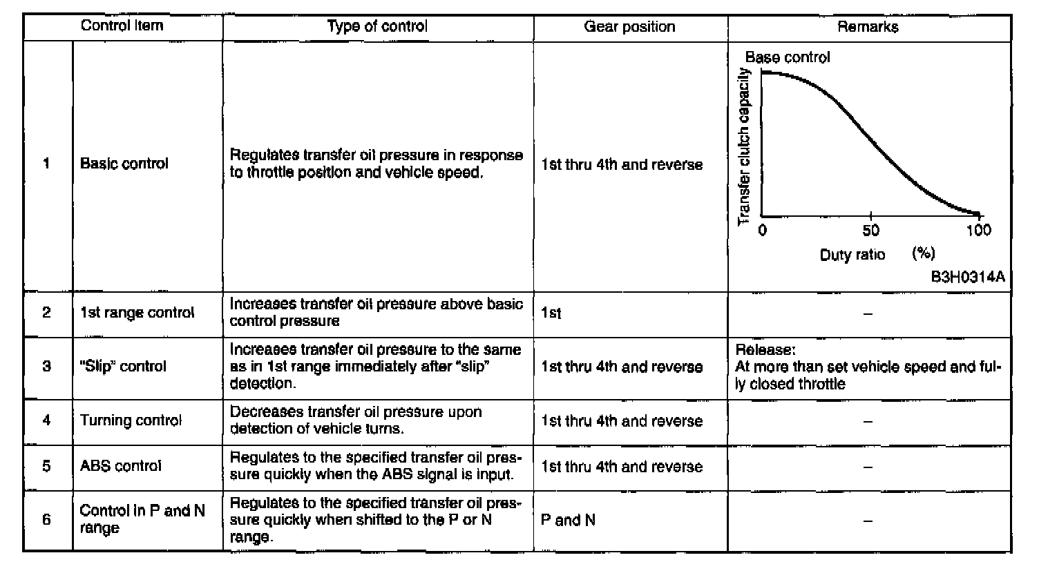 The hydraulic oil pressure (line pressure) is regulated by the duty solenoid C (transfer) and transfer control valve for obtaining optimum rear torque distribution corresponding to the driving conditions.
