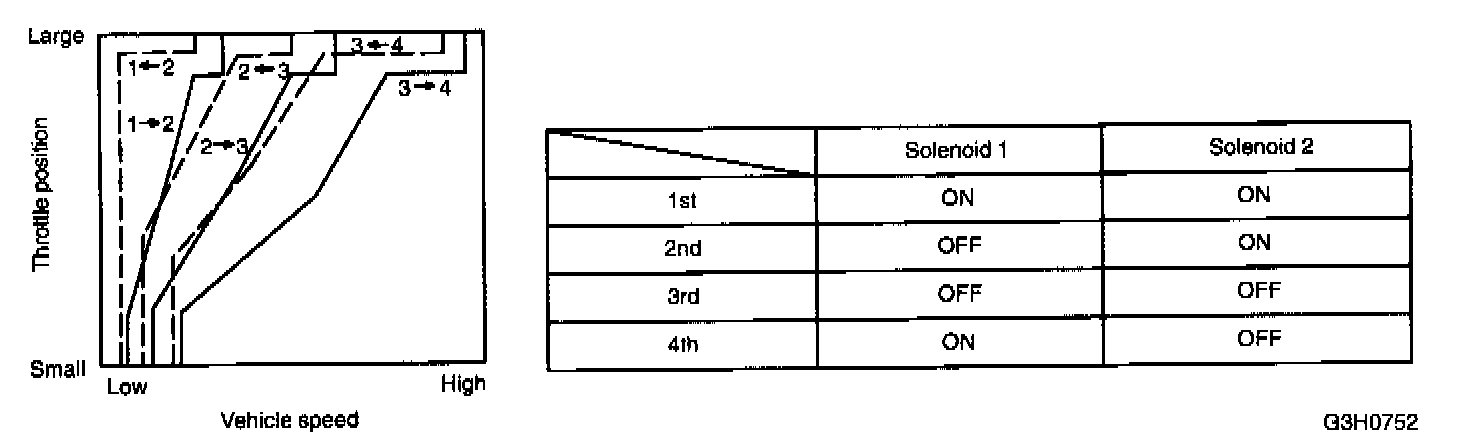- Gears are shifted by ON-OFF operation of both solenoids as indicated in Table.