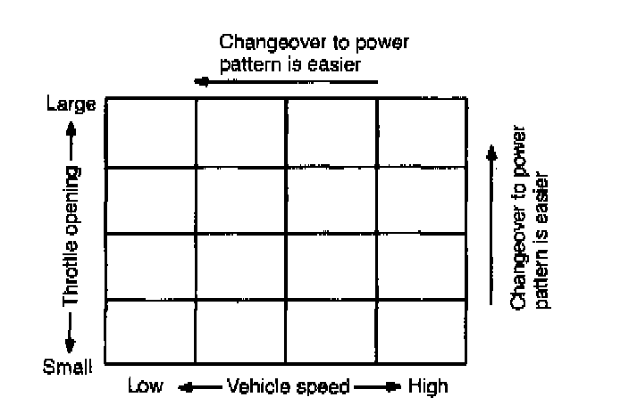 The power pattern is shifted to the normal pattern, depending on car speed. Shifting to the normal pattern is determined by the throttle position as shown in Figure below. Time lag in shifting is also determined by car speed. The maximum time lag is 3 seconds.