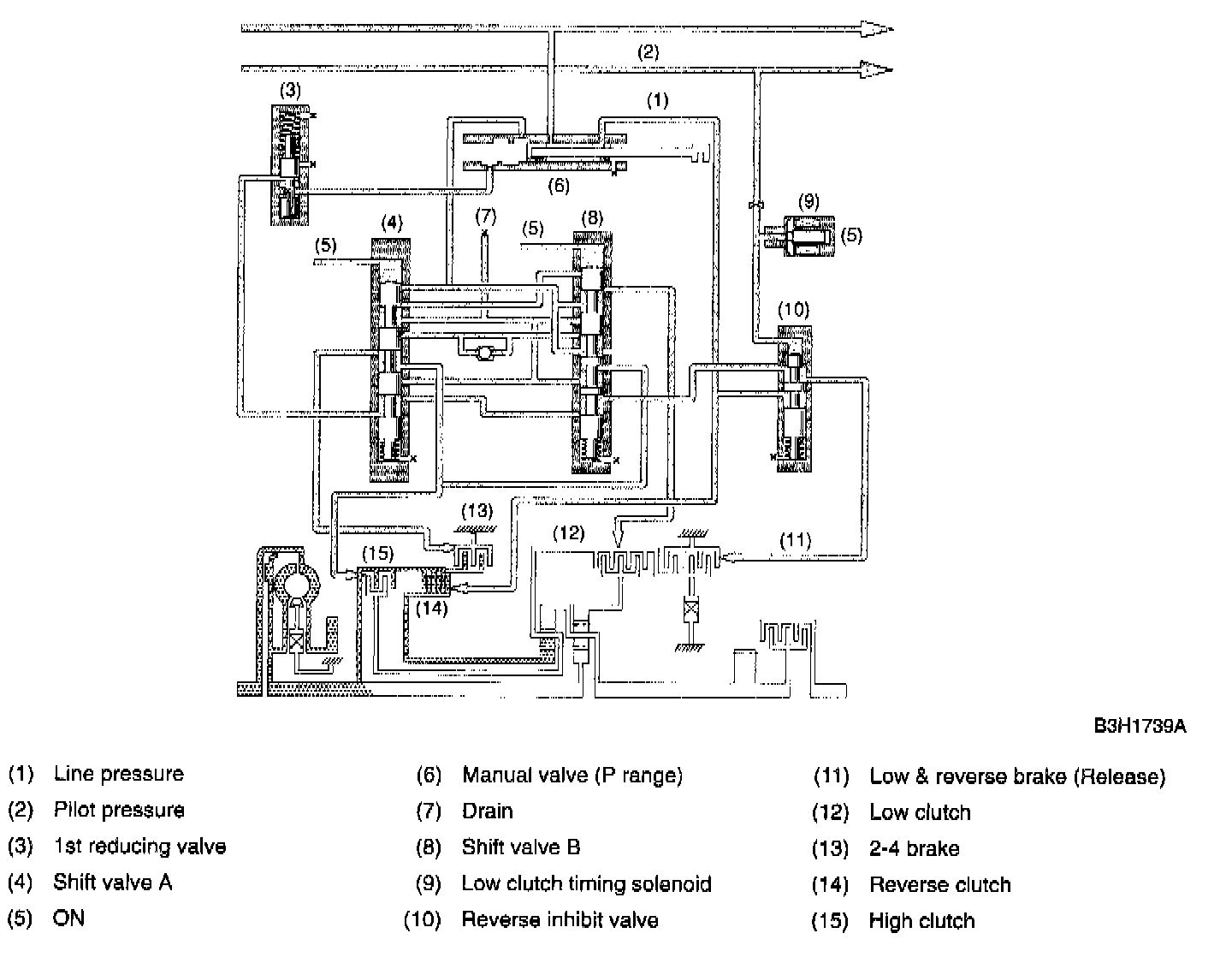 If "R" range is selected during driving at a speed higher than the predetermined, the low clutch timing solenoid is energized. Then, the pilot pressure is supplied to the reverse inhibit valve. This causes the reverse inhibit valve to move downward, closing the low & reverse brake port. In this condition, the low & reverse brake does not engage since the ATF flowing from the manual valve is blocked by the reverse inhibit valve. As a result, the transmission is put into Neutral, and the shifting into reverse is inhibited.