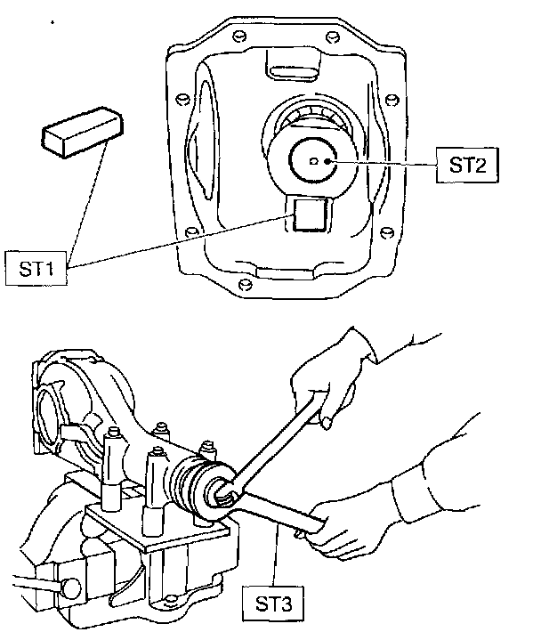 - When tightening the drive pinion nut, lock ST1 with ST2 as shown in the figure.