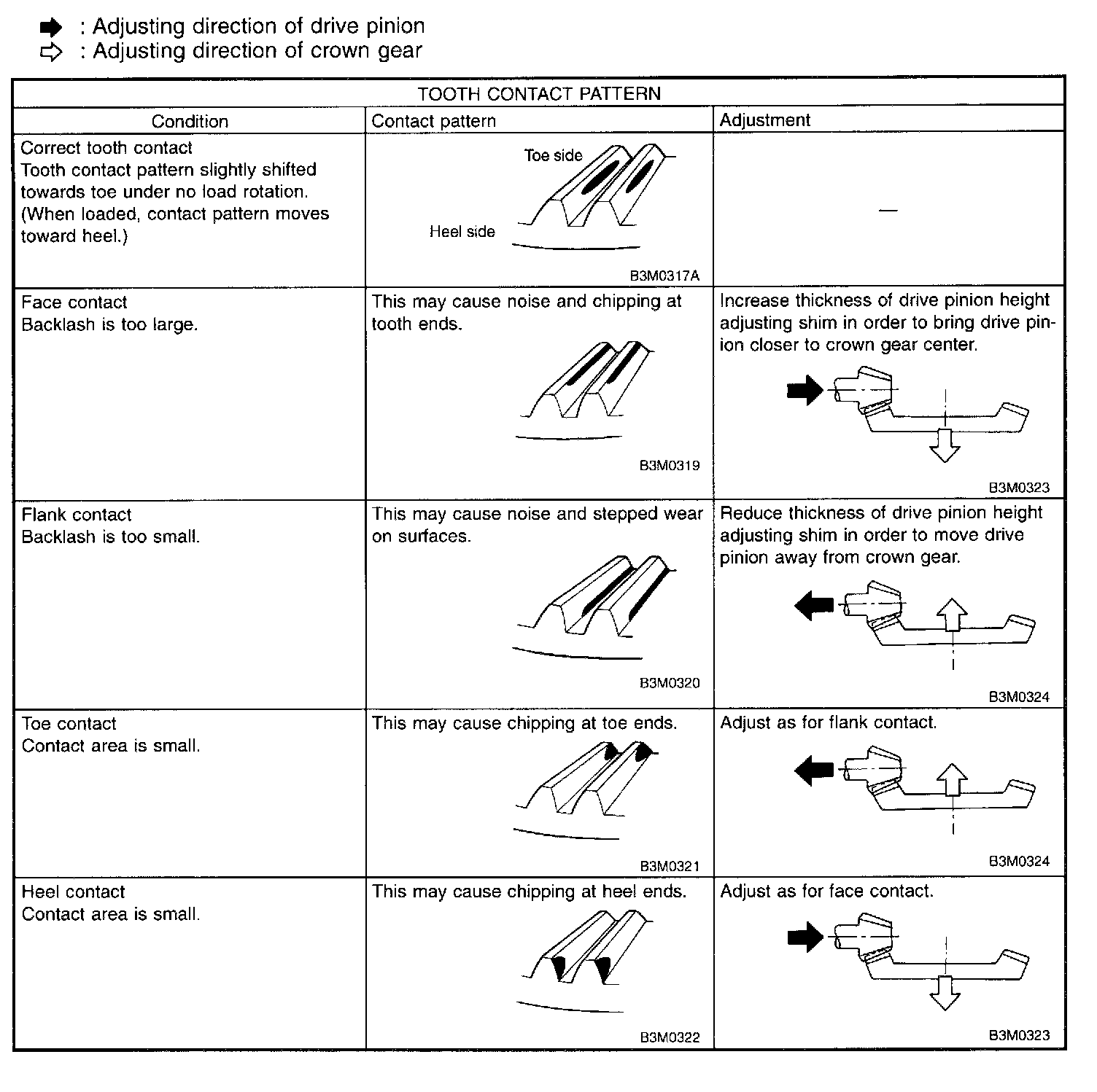 2. When the contact pattern is incorrect, readjust according to the instructions given in "TOOTH CONTACT PATTERN".