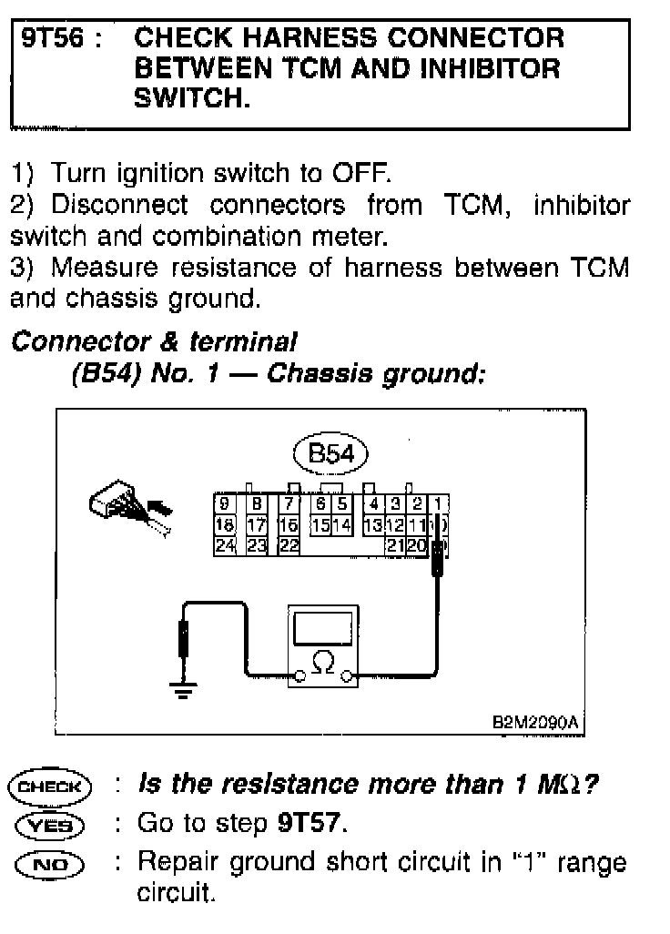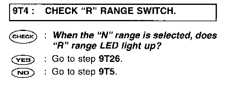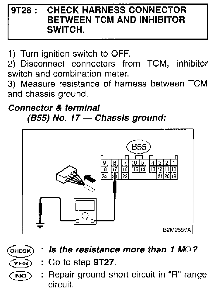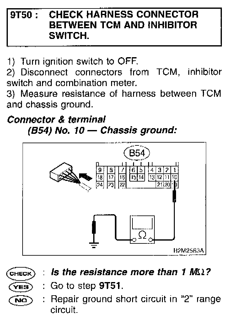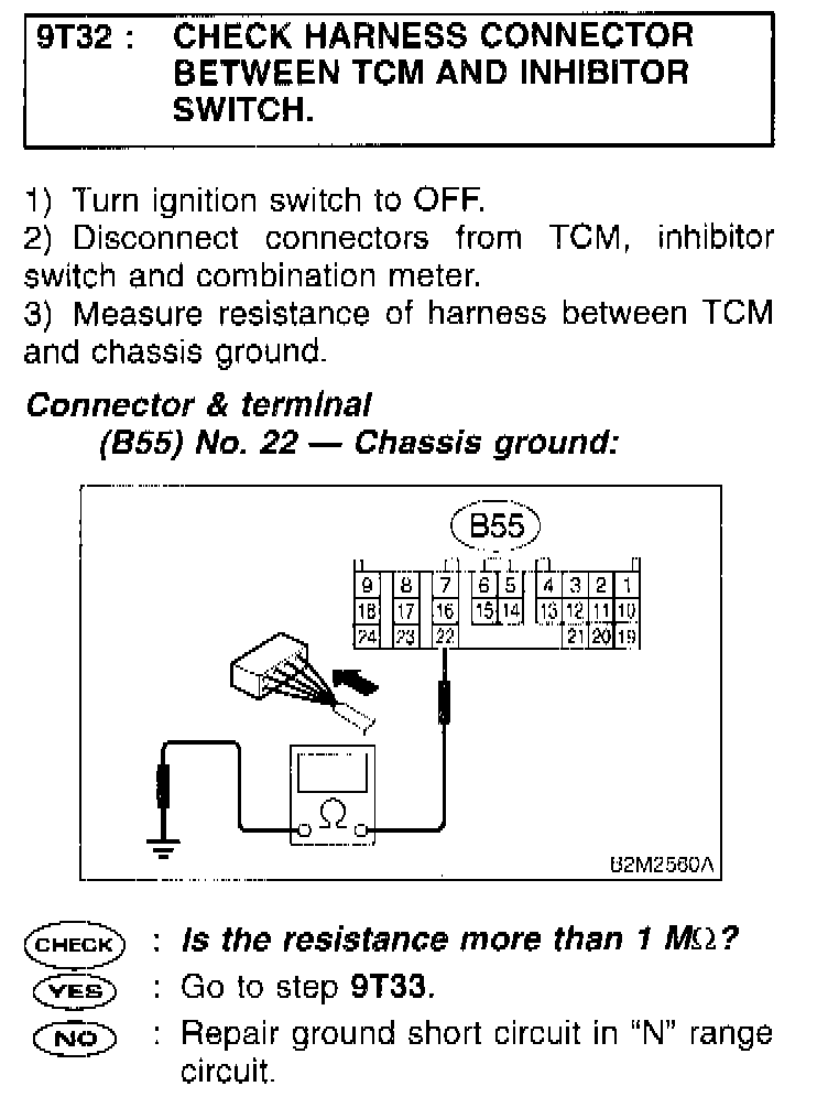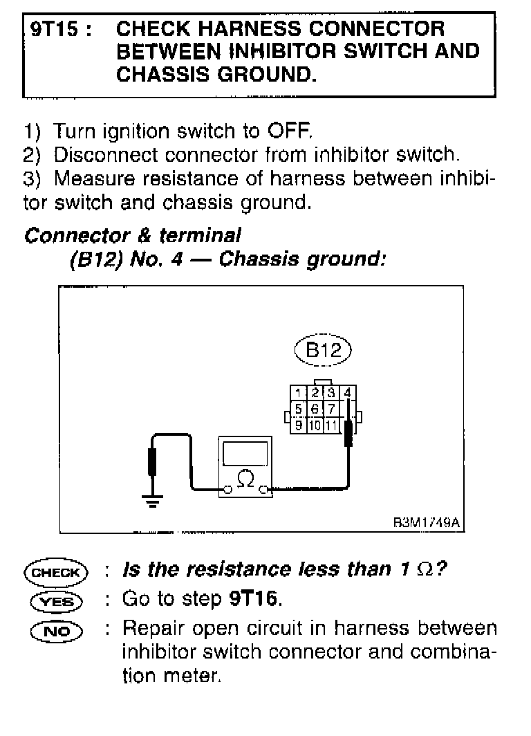 9T15: CHECK HARNESS CONNECTOR BETWEEN INHIBITOR SWITCH AND CHASSIS GROUND.