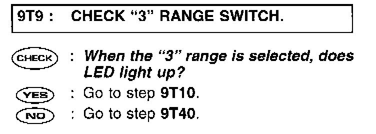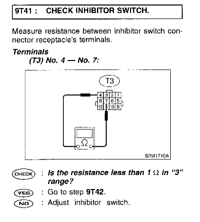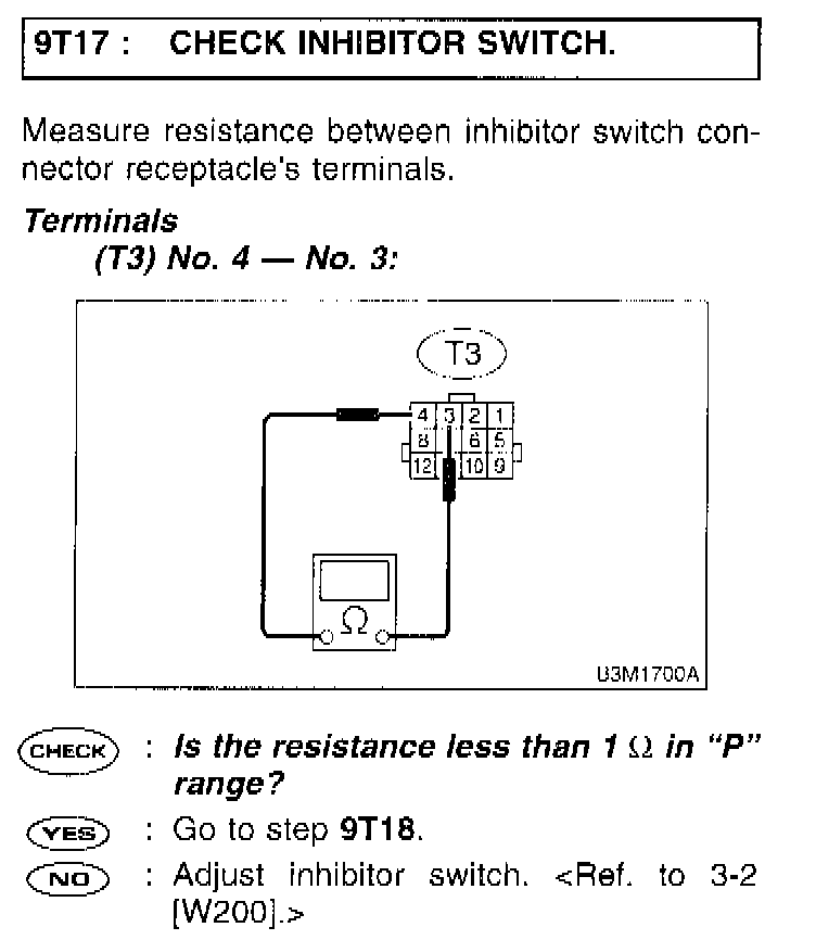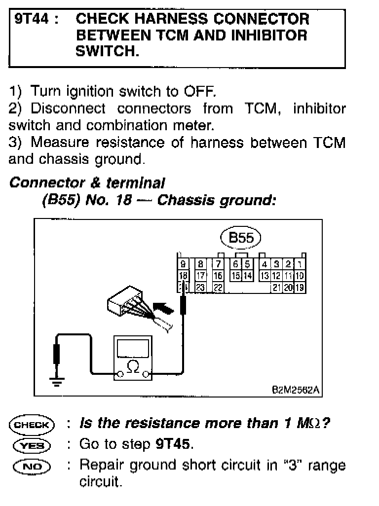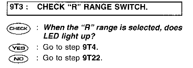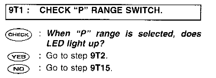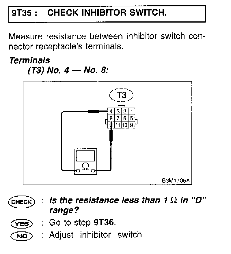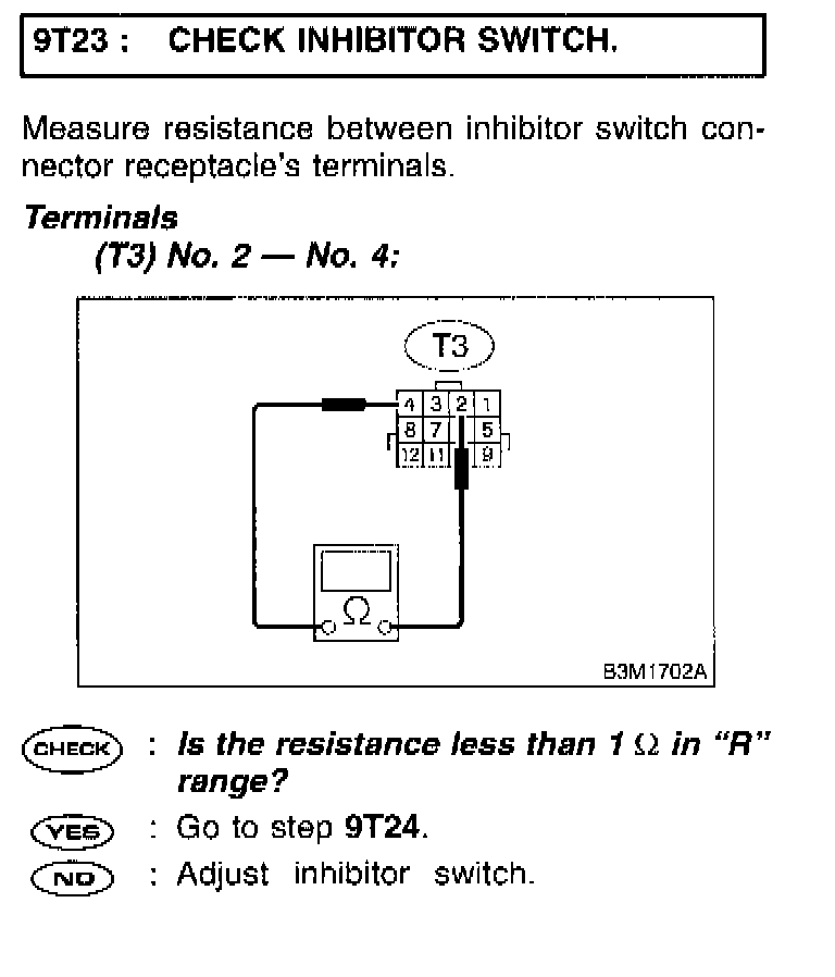 9T15: CHECK HARNESS CONNECTOR BETWEEN INHIBITOR SWITCH AND CHASSIS GROUND.