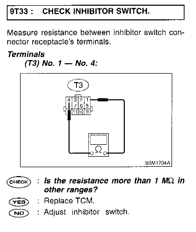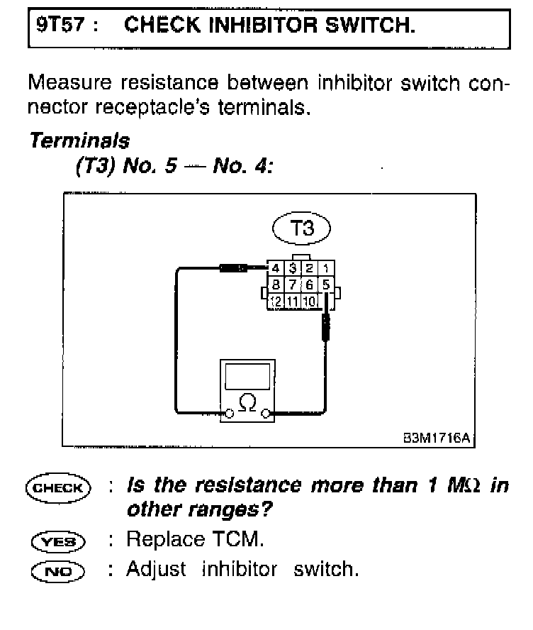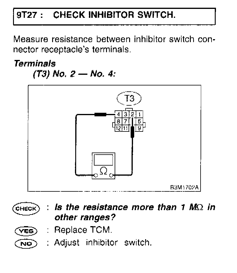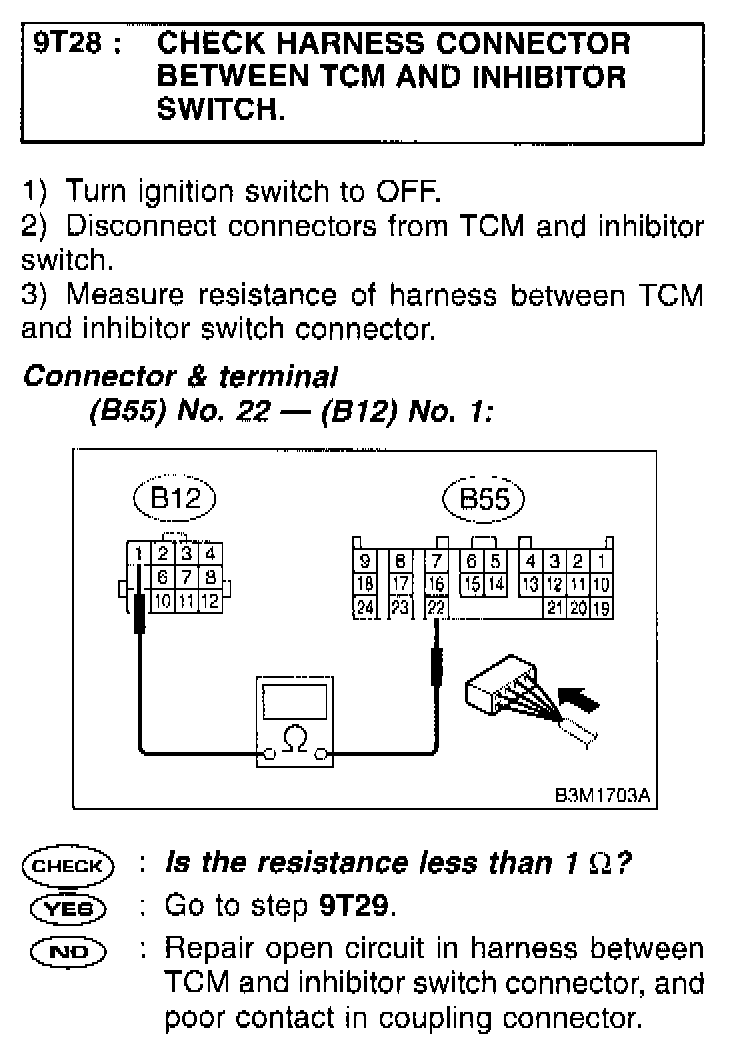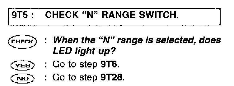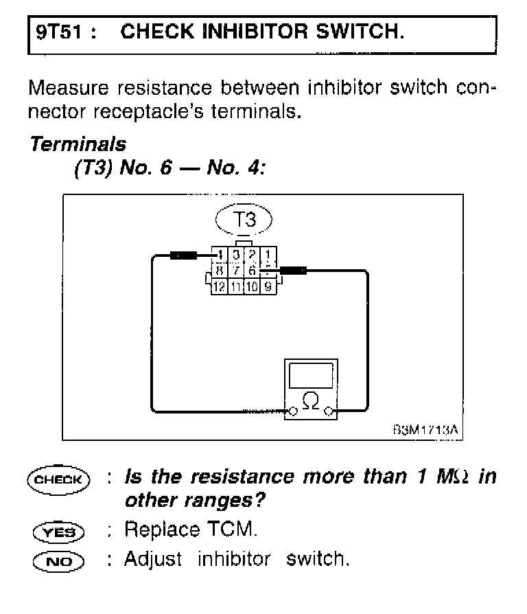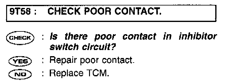 9T28: CHECK HARNESS CONNECTOR BETWEEN TCM AND INHIBITOR SWITCH.