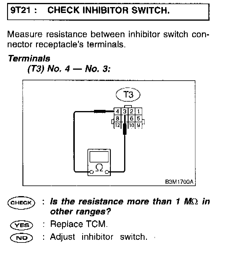 9T20: CHECK HARNESS CONNECTOR BETWEEN TCM AND INHIBITOR SWITCH.