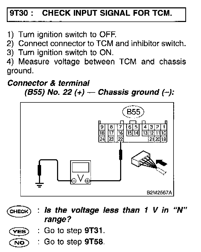 9T22: CHECK HARNESS CONNECTOR BETWEEN TCM AND INHIBITOR SWITCH.