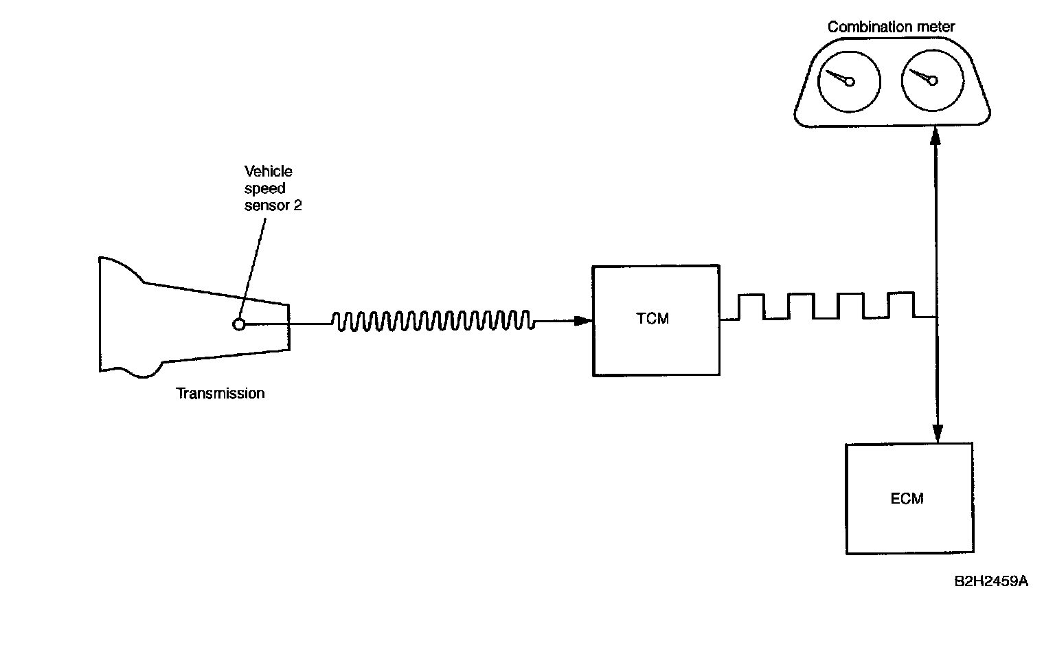 - The vehicle speed sensor 2 generates a 16-pulse signal for every rotation of the front differential and send it to the TCM. The signal sent to the TCM is converted there in a 4-pulse signal, and then sent to the ECM and the combination meter.