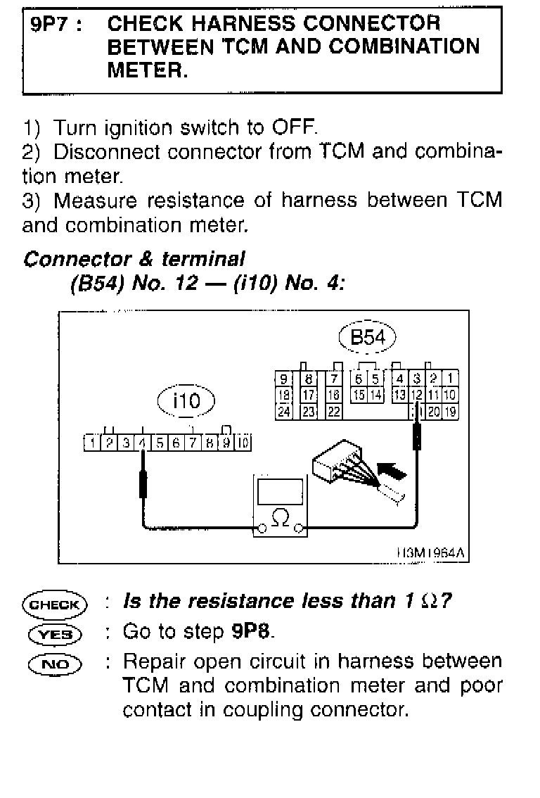 9P7: CHECK HARNESS CONNECTOR BETWEEN TCM AND COMBINATION METER.