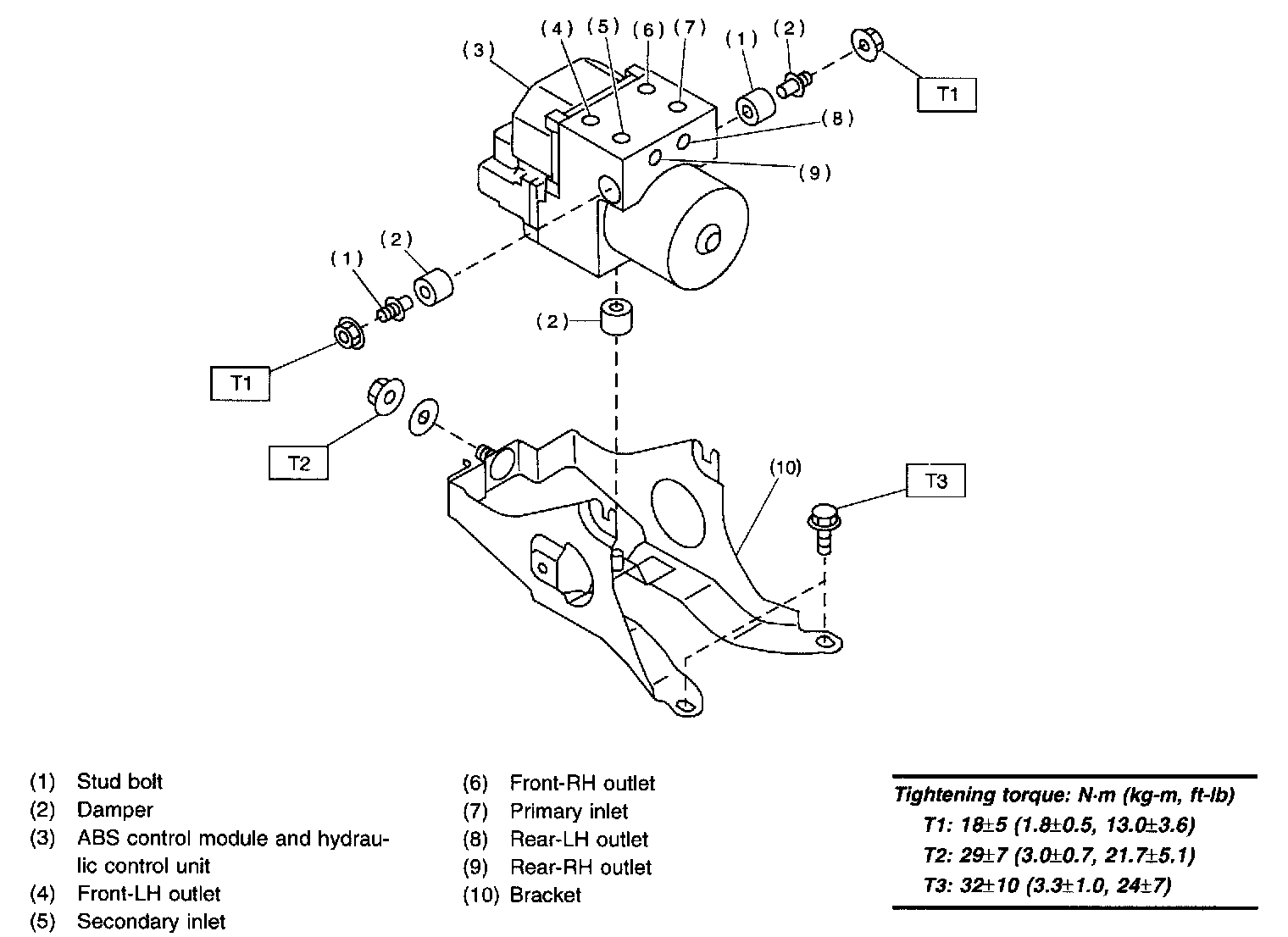 Brake pipe tightening torque: 15 +3/-2 Nm (1.5 +0.3/-0.2 kg-m, 10.8 +2.2/-1.4 ft. lbs.)