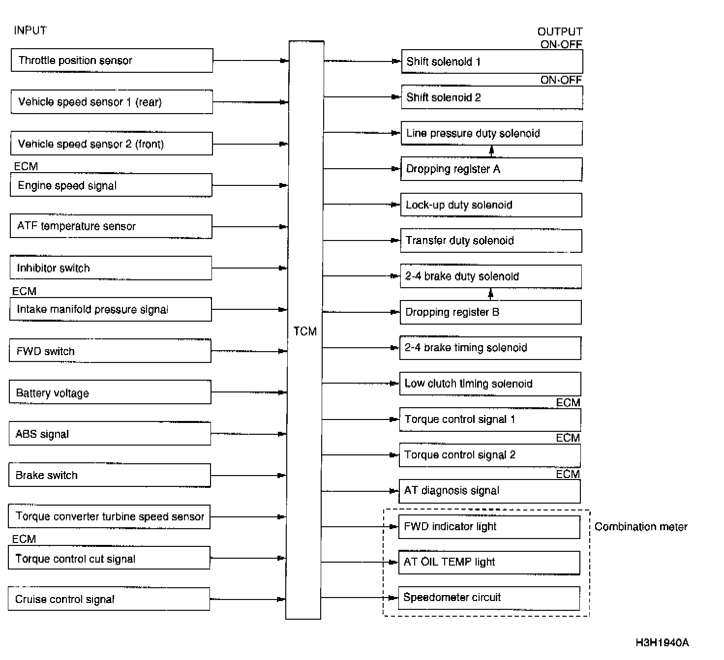 The TCM converts the signals into 4-pulse normal wave signals and outputs them to the Engine Control Module (ECM) and the combination meter.