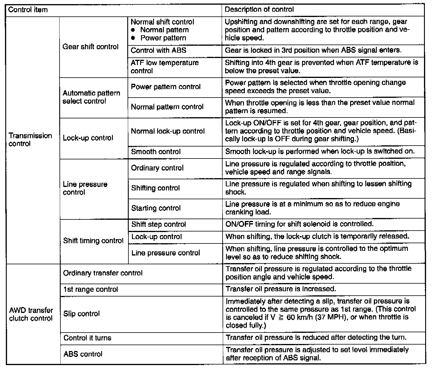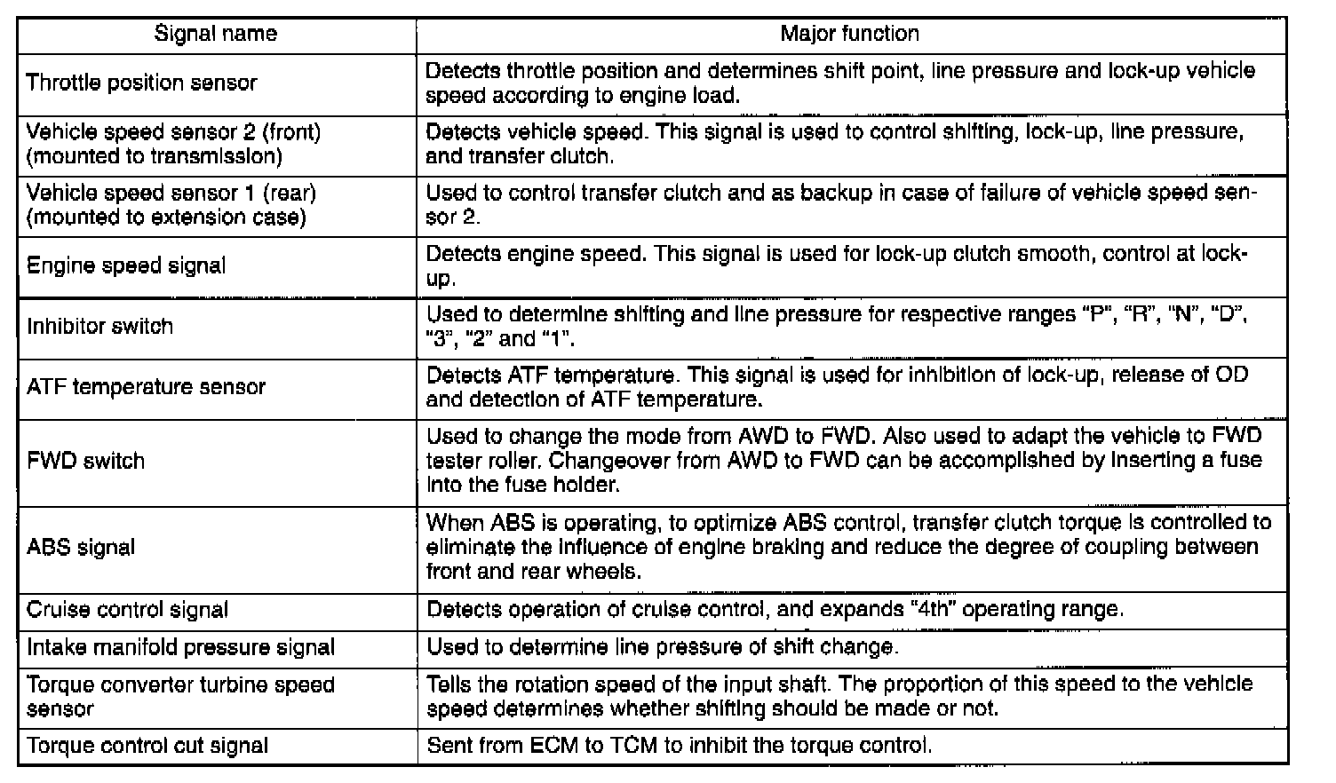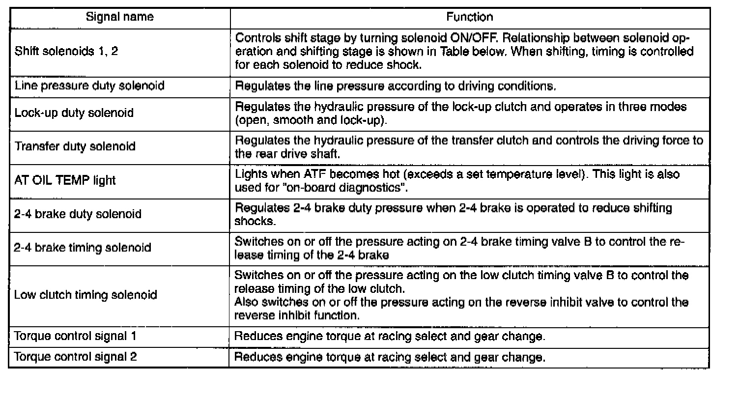 The electronic-hydraulic control system consists of various sensors and switches, a Transmission Control Module (TCM) and the hydraulic controller including solenoid valves. The system controls the transmission proper including shift control, lock-up control, timing control, reverse inhibit control, engine control, line pressure control, auto pattern select control and shift timing control. It also controls the AWD transfer clutch. In other words, the system detects various operating conditions from various input signals and sends output signals to shift solenoids 1 and 2, low clutch timing solenoid, 2-4 brake timing solenoid, line pressure, lock-up, transfer and 2-4 brake duty solenoids (a total of eight solenoids).
